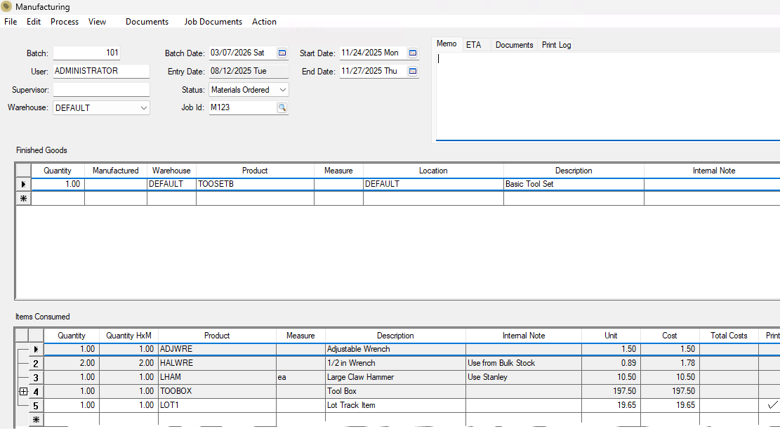 - The optional ETA Date can be entered into a batch similar to an expense invoice. The ETA Date can be calculated from the finished good's primary vendor Lead Time (which is set within the vendor record Terms tab) or by using the Lead Time setting for the vendor record that is set in Inventory > Options > Manufacturing tab > Default MFG "Vendor" for lead times.