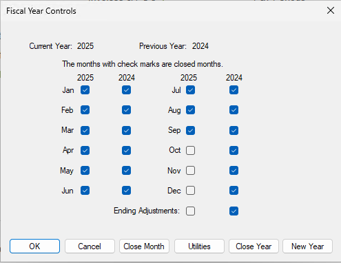 The Fiscal Year Controls always lists two sets of monthly periods. EBMS restricts any financial transactions to these 2 years. Each of the possible open monthly periods contains a month open or closed checkmark option.